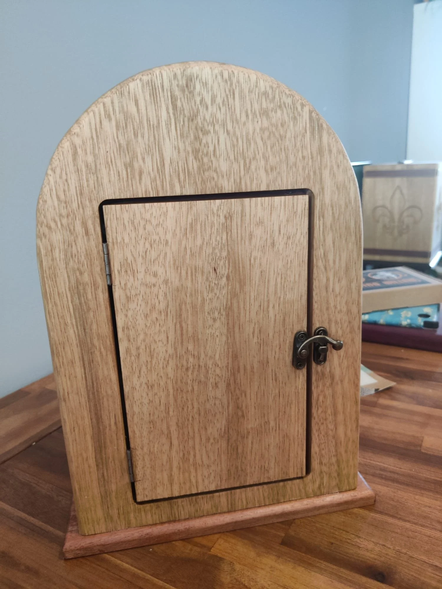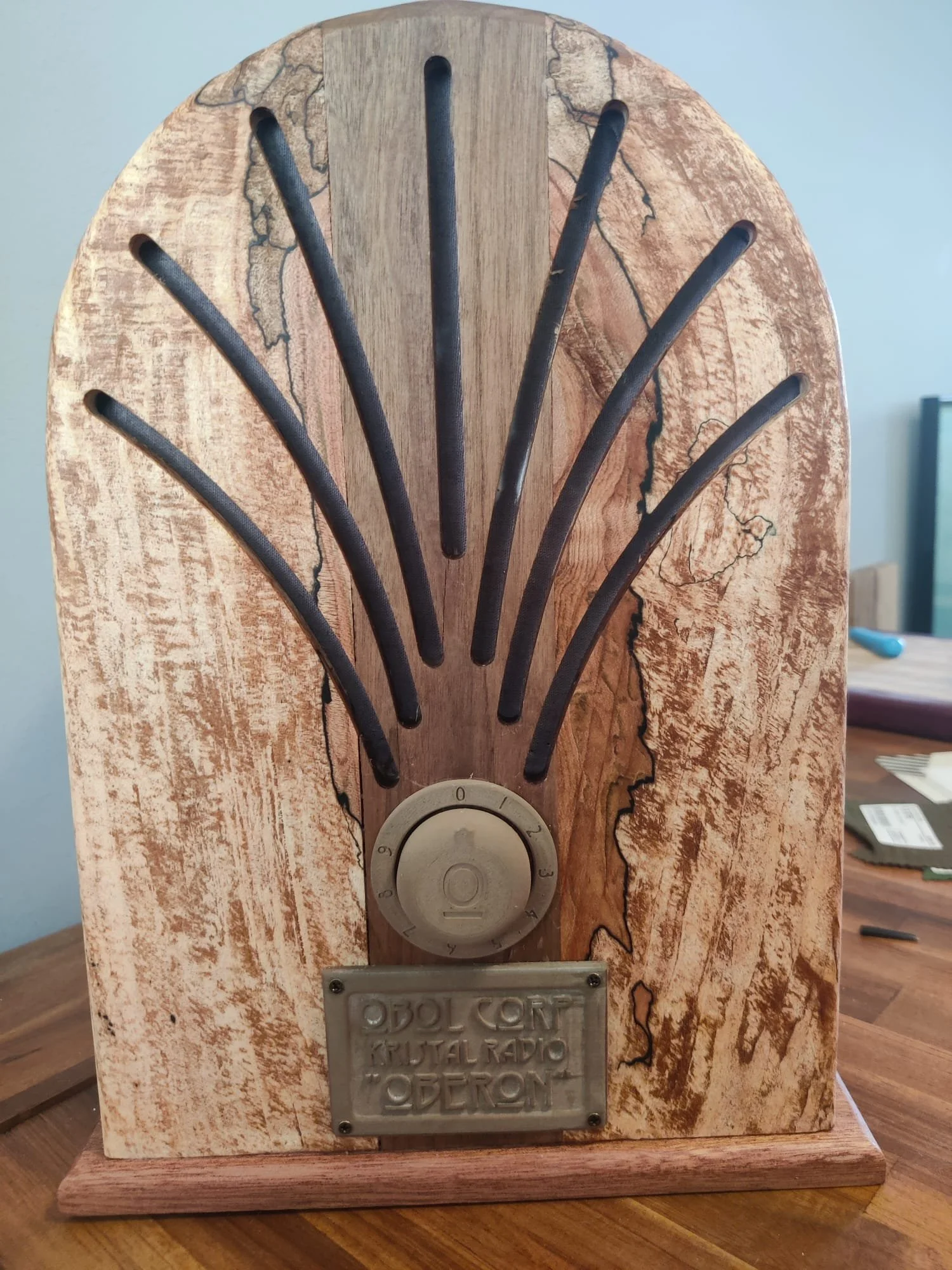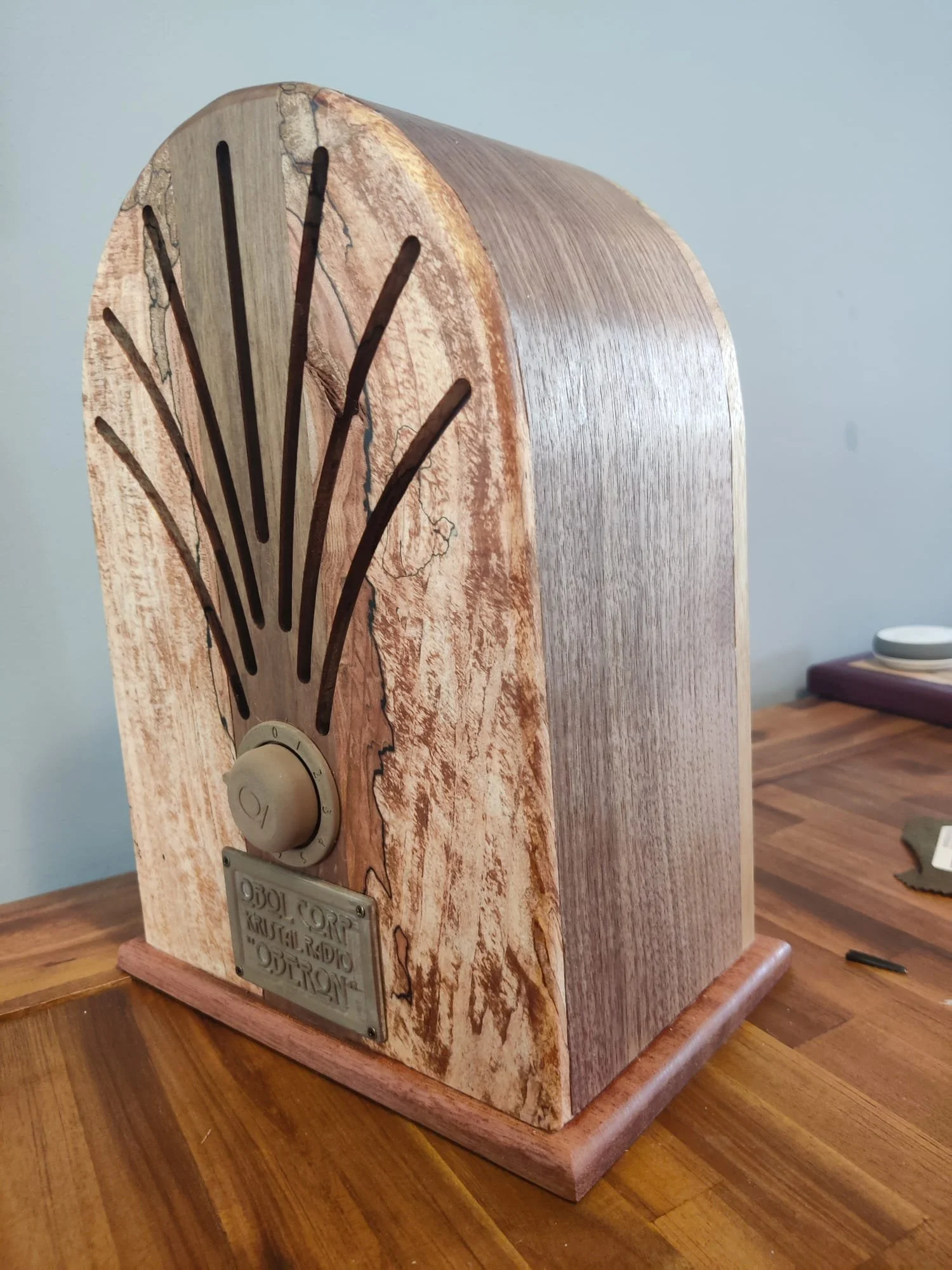Introducing the "Oberon," a delightful blend of aesthetics, nostalgia, and functionality. This meticulously crafted 1910 style radio serves as a whimsical prop for Live Action Role Play (LARP). Much more than just a visual treat, Oberon promises an immersive experience for users by actually playing music.