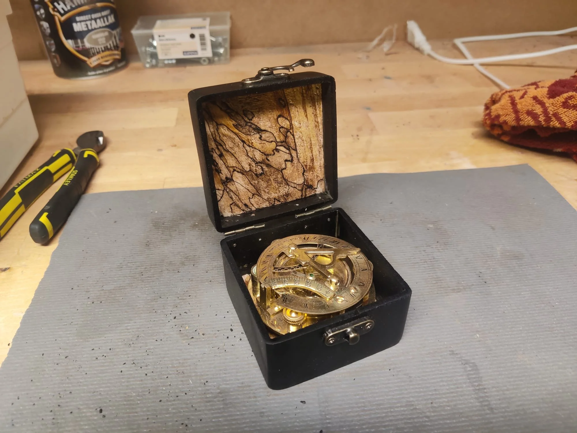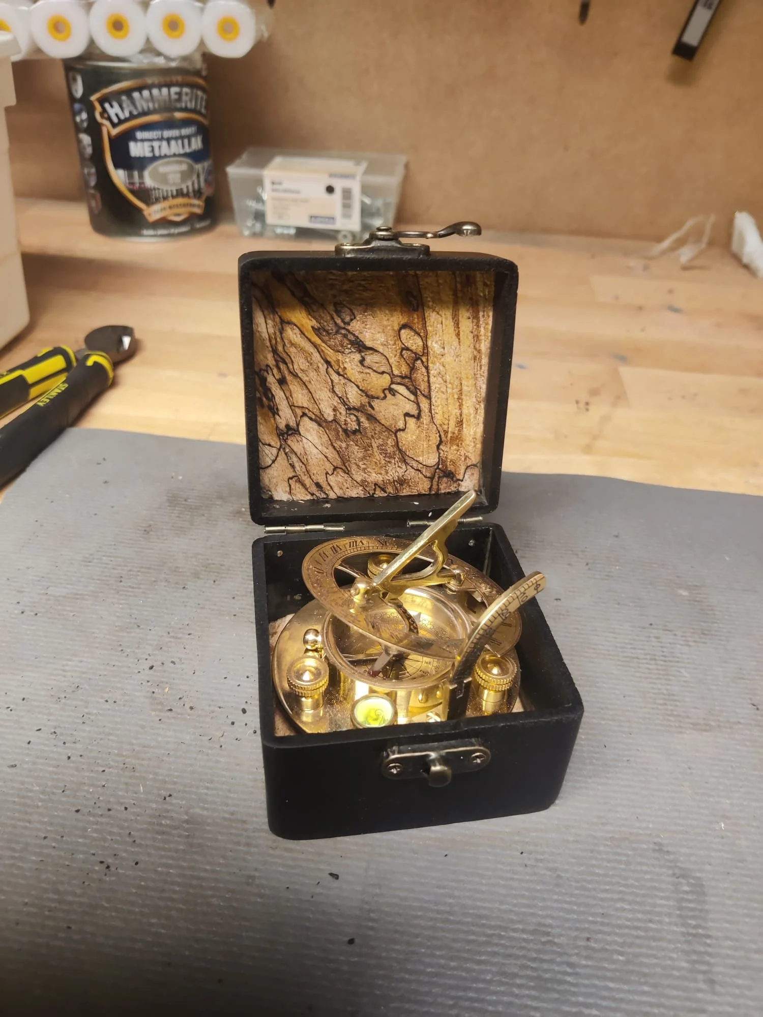 In crafting this artefact, the wood was first shaped into a single whole piece and then delicately sawn in half to form the box and lid. Each half harmoniously comes together to encapsulate the perfect home for a brass replica compass, exhibiting a marriage of functional design and visual appeal.